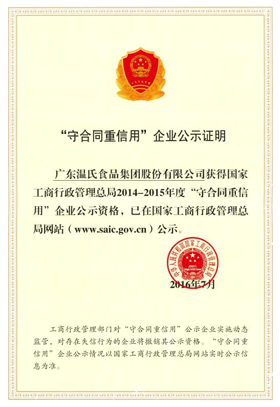 国家工商行政管理局2014-2015年度“守条约重信用”企业公示资格