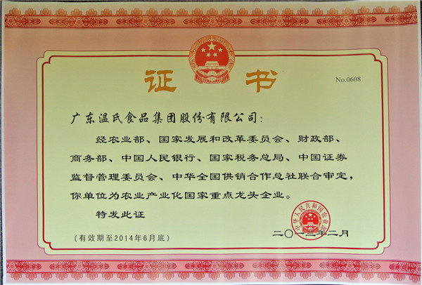 尊时凯龙集团通过国家第六次检测,,,,,继续享有农业工业化国家重点龙头企业称呼(有用期至2016年12月尾)