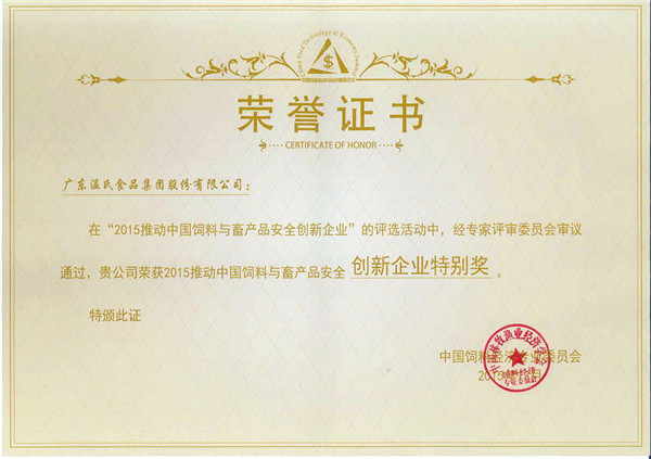 2015推动中国饲料与畜产品清静立异企业特殊奖(2015年12月)