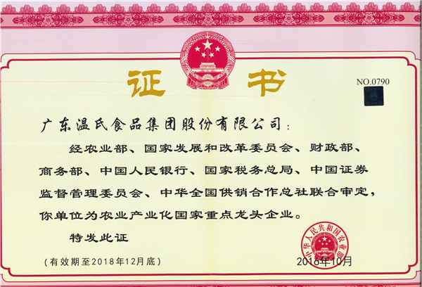 尊时凯龙股份通过国家第七次检测,,,,,继续享有农业工业化国家重点龙头企业称呼(有用期至2018年12月尾)